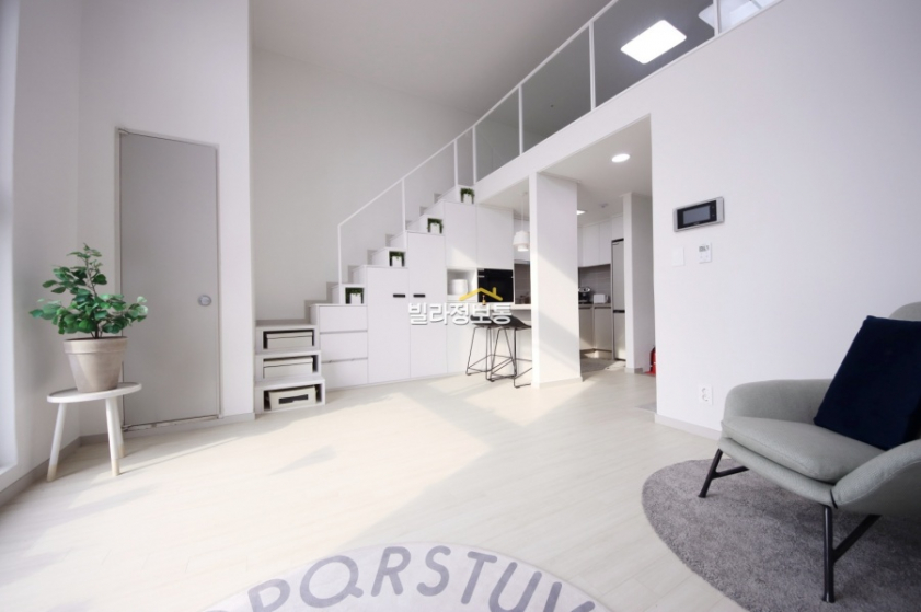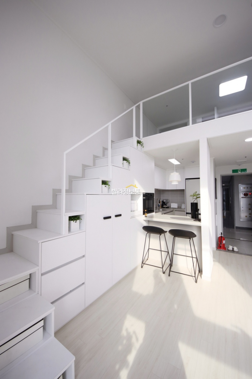 시흥신축빌라 현장은 경기 시흥시 대야동에 위치한 신축 오피스텔이며 1개동 13층 높이의 건물로 총 78세대가 거주할 수 있어요. 버스정류장이 도보 1분 거리, 가장 가까운 전철역은 신천역으로 도보 10분 정도로 대중교통을 이용하기에 정말 좋은 위치에 있습니다. 자차로는 시흥나들목과 신천나들목이 인접해 있어 타도심으로 이동하기 수월합니다. 주변으로 초, 중, 고등학교 모두 도보권으로 많이 포진되어 있어서 학세권 입지기도 합니다. 앞쪽으로는 잘 정비된 깨끗한 도로에 뒤쪽으로는 맛집과 카페 등 여러가지 먹거리들이 많은 먹자골목이 있어 좋아요. 길만 건너면 대형마트가 있어서 장보기, 쇼핑, 외식 등 편리하게 생활 할 수 있는 시흥 대야동 복층 현장입니다. 현관으로 들어서면 커다란 거실 창으로 햇살이 쏟아져 들어오는 게 너무 예뻐요. 층고가 굉장히 높아서 답답함이 1도 없으며, 창이 크고 넓어서 채광이 엄청 좋아요. 높은 층이라 뷰도 좋네요~ 아담한 디귿자 모양의 동선이 편리한 주방에는 냉장고, 세탁기, 오븐 등 잘 갖춰져 있어요. 상부장과 하부장도 넉넉하게마련되어 있어서 주방 용품이나 그릇들이 많아도 수납하기 좋겠어요. 아일랜드 식탁이 있어서 1~2명 식사하기 좋아 보입니다. 복층 계단 아래는 수납할 수 있는 공간들이 많이 시공되어 있어서 여러 가지 생활 짐들을 수납, 보관할 수 있겠네요. 복층으로 올라오시면 수납 공간이 더 많이 있어 옷이나 이불을 수납하셔도 좋겠습니다. 낮은 침대와 협탁을 두고 침실 공간으로 활용하면 좋아요.