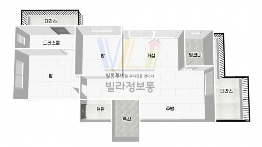 ■ 투룸에서 보기 힘든 거실-방-방-드레스룸 나열 구조로 모든 공간에 햇살이 가득합니다.