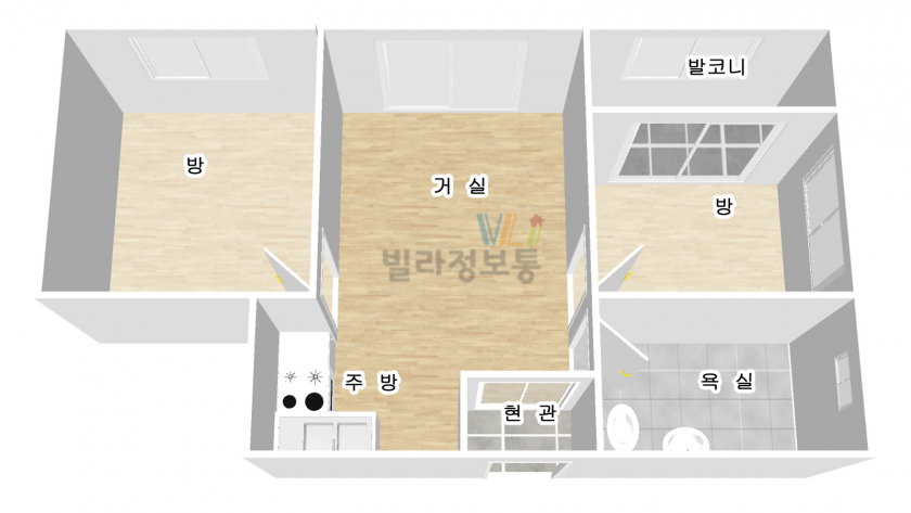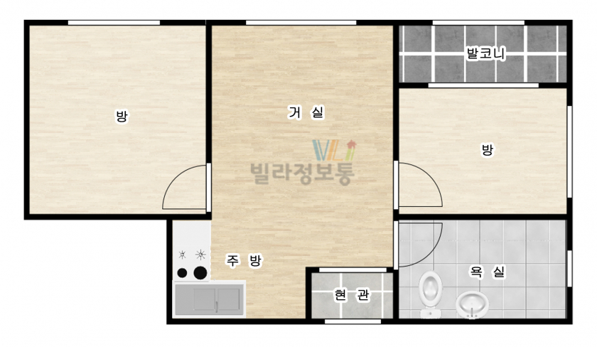 서울 지역 내 평균적인 2룸 사이즈 대비 거실, 큰 방 사이즈가 넉넉하게 구성된 구조입니다.
